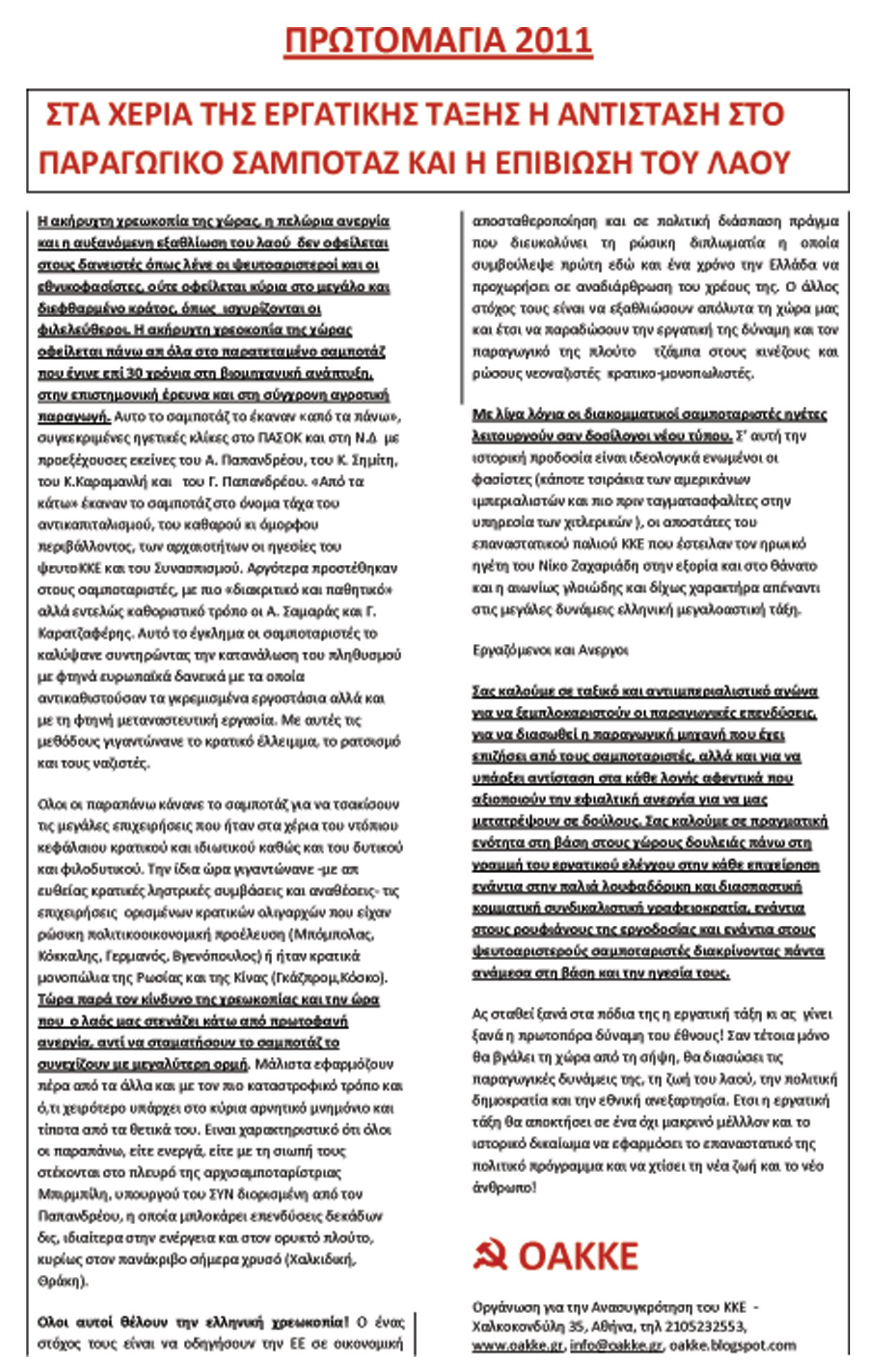 ανατολικοί μαζεύουν τον καρπό. Η στρατιωτική επέμβαση στη Λιβύη με απόφαση του ΟΗΕ αποτελεί πρωτοφανή και βάναυση καταπάτηση του δικαιώματος μιας χώρας να αποφασίζει για την εσωτερική της διακυβέρνηση και πρέπει να καταδικαστεί από κάθε δημοκρατικό άνθρωπο. Οι επεμβατιστές επικαλούνται την υποχρέωσή τους να προστατεύσουν τη ζωή απειλούμενων αμάχων. Αλλά το δικαίωμα αυτό το έχουν τρίτες χώρες μόνο στην περίπτωση που επιχειρείται γενοκτονία πράγμα που προφανώς δεν έγινε εδώ. Στη Λιβύη υπάρχει εμφύλιος και η πιο αντιδραστική πλευρά αυτού του εμφύλιου ήταν εκείνη που σήκωσε τη σημαία της «δημοκρατικής επανάστασης» γιατί αυτή είναι που κάλεσε τις πιο επεμβατικές και πιο φασιστικές υπερδυνάμεις να επέμβουν στη χώρα της... Η ΒΡΩΜΙΚΗ ΕΠΙΘΕΣΗ ΤΟΥ ΟΗΕ ΣΤΗ ΛΙΒΥΗ ΤΕΡΑΣΤΙΟ ΠΛΗΓΜΑ ΓΙΑ ΤΗΝ ΙΔΙΑ ΚΑΙ ΤΗΝ ΕΥΡΩΠΗ ΟΙ ΙΜΠΕΡΙΑΛΙΣΤΈΣ ΤΗΣ ΔΥΣΗΣ «ΤΙΝΑΖΟΥΝ ΤΗΝ ΕΛΙΑ» ΟΙ ΝΕΟΝΑΖΙΣΤΙΚΕΣ ΡΩΣΙΑ ΚΑΙ ΚΙΝΑ «ΜΑΖΕΥΟΥΝ ΤΟΝ ΚΑΡΠΟ» Η στρατιωτική επίθεση στη Λιβύη με εντολή του Συμβουλίου Ασφαλείας του ΟΗΕ αποτελεί ένα ποιοτικό άλμα, μια κατάφωρη καταπάτηση της βασικής αρχής της ειρηνικής συνύπαρξης, που είναι η μη επέμβαση ενός κράτους στα εσωτερικά ενός άλλου δηλαδή η αφαίρεση του δικαιώματος του να διαλέγει την κυβέρνηση και τον τρόπο της διακυβέρνησής του. Αν γίνει δεκτή η λογική αυτής της επέμβασης τότε κάθε εσωτερική διαπάλη σε μια χώρα που θα παίρνει αιματηρά χαρακτηριστικά θα δίνει το δικαίωμα στα 5 μόνιμα μέλη του Συμβουλίου Ασφαλείας να της επιβάλλουν διακυβέρνησή και διαμοιρασμό της εξουσίας ανάλογα με την ισχύ του καθενός από αυτά. Αν αυτό το γεγονός συνδυαστεί με το ότι ανάμεσα σε αυτά τα 5 κράτη τα 3 κυρίαρχα είναι η υπερεπεμβατική και αλαζονική ΗΠΑ, η προσαρτησιακή νεοχιτλερική Ρωσία και η οικονομικά άπληστη Κίνα, καταλαβαίνει κανείς ποια εποχή βαρβαρότητας στις διεθνείς σχέσεις ανοίγει η επέμβαση της Λιβύης. Τα πράγματα είναι ακόμα χειρότερα αν... ΑΝΑΚΟΙΝΩΣΗ ΤΥΠΟΥ Όχι στην τραμπούκικη τρομοκρατία του ΣΥΝ και την κρατική της πολιτική κάλυψη Η ΟΑΚΚΕ καταδικάζει τη νέα οργανωμένη τραμπούκικη επίθεση του Συνασπισμού στο Θ. Πάγκαλο,. Ο ισχυρισμός του Συνασπισμού ότι δεν βρίσκεται ο ίδιος πίσω από αυτές τις επιθέσεις ακυρώνεται από την ώρα που δεν τις καταδικάζει αλλά αντίθετα τις καλύπτει πολιτικά, θεωρώντας τες ουσιαστικά αυθόρμητες αντιδράσεις δικαιολογημένα αγανακτισμένων πολιτών εξ αιτίας των συγκεκριμένων θέσεων που έχει πάρει ο Πάγκαλος. Αυτή είναι φασιστική λογική... Αφίσα της ΟΑΚΚΕ που κυκλοφόρησε στις 11 Μάρτη ΥΠΑΡΧΕΙ ΔΙΕΞΟΔΟΣ: ΝΑ ΣΤΑΜΑΤΗΣΟΥΜΕ ΤΟΥΣ ΣΑΜΠΟΤΑΡΙΣΤΕΣ! Μια πελώρια συμφορά κρέμεται πάνω από τη χώρα. Δεν εννοούμε απλά την χρεωκοπία γιατί πολλές χώρες έχουν χρεωκοπήσει και έχουν υποφέρει αλλά τελικά έχουν ανορθωθεί. Η συμφορά στην περίπτωσή μας είναι ότι συνεχίζεται με ακόμα πιο έντονους ρυθμούς η αρρώστεια που έφερε την ακήρυκτη χρεωκοπία. Πρόκειται για το συστηματικό σαμποτάζ της παραγωγής σε όλους τους τομείς και η στρατηγική αποεπένδυση, ιδιαίτερα η αποβιομηχανοποίηση της χώρας. Οι... ΟΙ ΙΣΛΑΜΟΦΑΣΙΣΤΕΣ ΠΙΣΩ ΚΑΙ ΑΠΟ ΤΟ ΚΙΝΗΜΑ-ΠΡΑΞΙΚΟΠΗΜΑ ΣΤΗ ΛΙΒΥΗ Τα στοιχεία που έχουμε ως τώρα δείχνουν ότι μια ακόμα επιχείρηση «αιφνίδιας επανάστασης» ουσιαστικά ενός καλυμμένου στρατιωτικού πραξικοπήματος διεξάγεται σήμερα και στη Λιβύη με την ενίσχυση κινημάτων δυσαρεστημένων μαζών κάτω από ισλαμοφασιστική καθοδήγηση. Με λίγα λόγι
